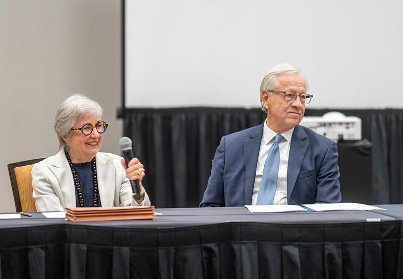 Pictured above: Greensboro Council Member District 4 Nancy Hoffmann (left) and Mayor J. Allen Joines (right) take a question from the audience during the roundtable.